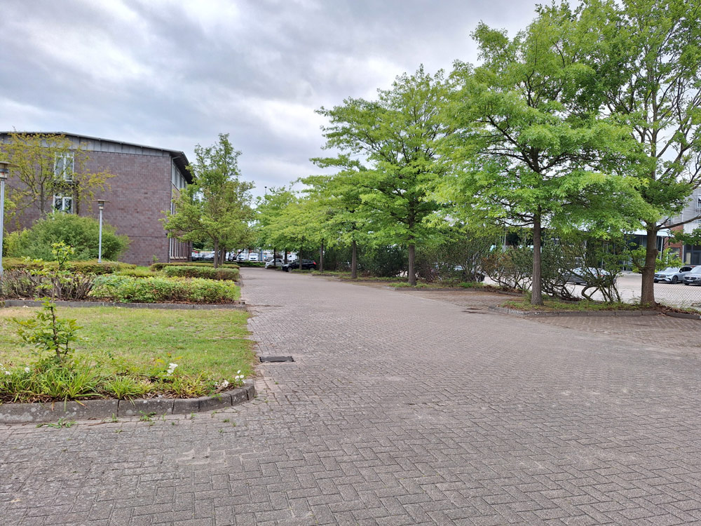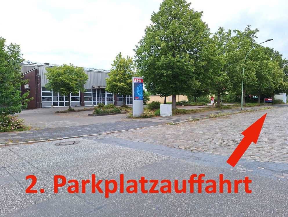 - auf dem Parkplatz bis zum Ende durchfahren (rechts ist eine lange gelbe Wand),